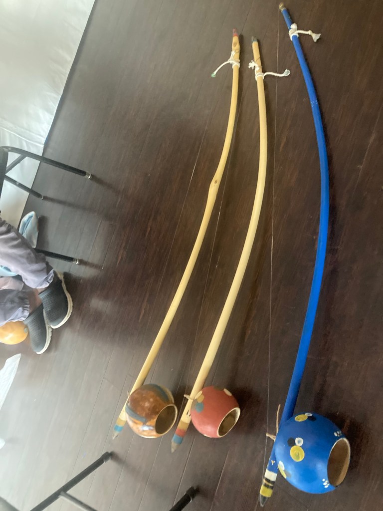 Sidenote: In the picture below, you see 3 berimbaus, each with its own unique story and significance. The 2 on the left are new and belonged to my friend Gigante of Capoeira Batuque. (Shout out to you, Gigante, for translating Mestre Negoativo’s insightful words during our musical journey). These impressive instruments were brought here from Brazil about a month ago, carefully chosen for their resonance and craftsmanship, but they weren’t armed (strung up) until that evening to allow them time to acclimate to the local weather conditions, ensuring they would produce the best sound possible.