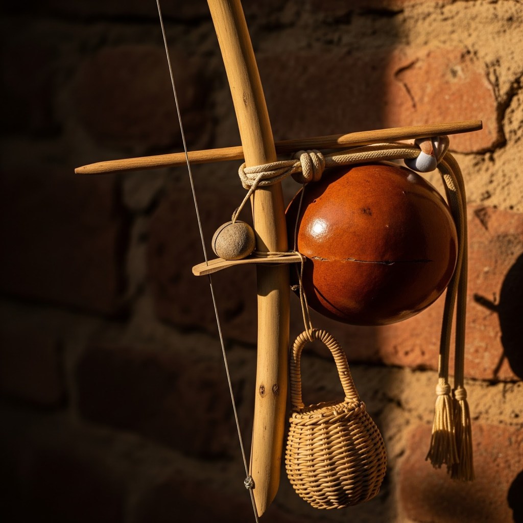 The unique and ingenious construction of the Berimbau, typically categorized as a single-string percussion instrument, contributes significantly and distinctively to its signature and instantly recognizable sound. Composed of three fundamental and interdependent elements—a flexible wooden bow (verga), a taut steel string (arame), and a hollowed gourd (cabaça) that ingeniously acts as a resonator—its simple yet brilliant design allows for a remarkable and extensive range of timbres and rhythmic variations. The skilled player, utilizing a small wooden stick (baqueta), a Caxixi (a woven rattle filled with seeds that adds a percussive layer, enriching the sonic texture), and a Dobrão (a coin or stone pressed against the arame), expertly manipulates the string and the opening of the gourd. This intricate interplay of these seemingly simple elements creates a sonic tapestry that is both primal in its resonance and sophisticated in its execution, drawing listeners irresistibly into its captivating and deeply enriching embrace, a testament to the ingenuity of its creators.
