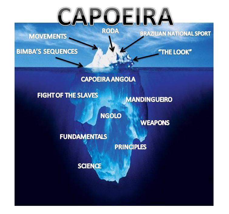 O.K., we are almost at the end of this page. The main thing I want to stress to you that what you’ve seen and read here, is just a tiny bit of information on the BASICS of the art of Capoeira Angola. And, what most people see, or know, about Capoeira is just the tip of a huge iceberg…