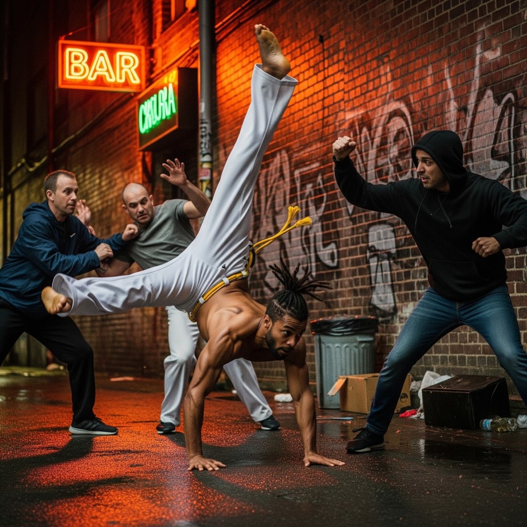 - Vulnerability to Multiple Attackers: The fluid, often expansive, and circular nature of Capoeira, while incredibly effective for engaging and evading a single opponent, can paradoxically make it challenging to defend against multiple assailants simultaneously. The focus on individual engagement, evasive maneuvers, and maintaining the jogo (game) can leave a practitioner exposed to flanking attacks, being surrounded, or a coordinated rush from several attackers. In such dire scenarios, more linear, defensive martial arts with a strong emphasis on guarding multiple angles, maintaining a central defensive posture, and efficient target neutralization might offer better tactical options. The sheer number of threats can overwhelm the Capoeirista’s ability to constantly evade and reposition.