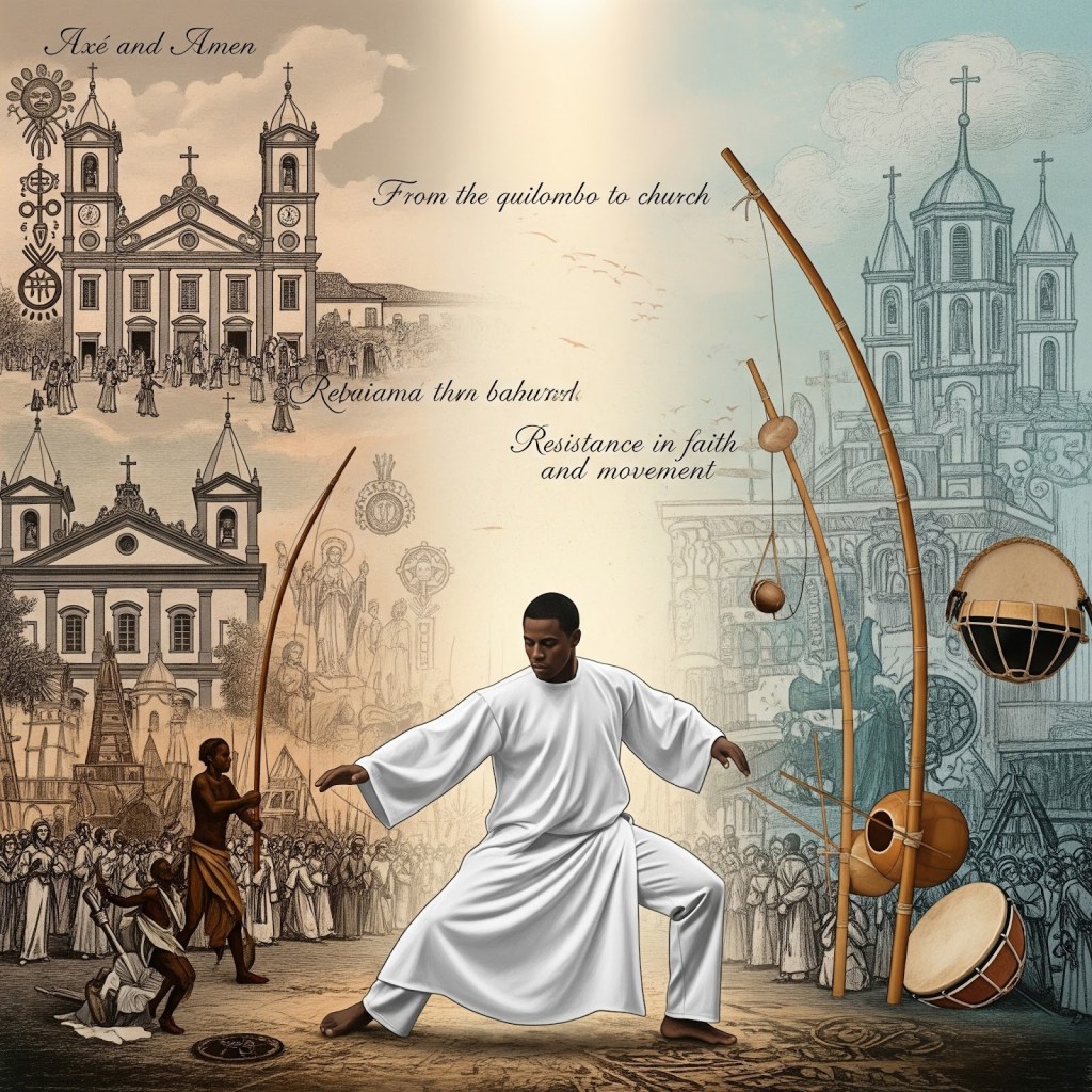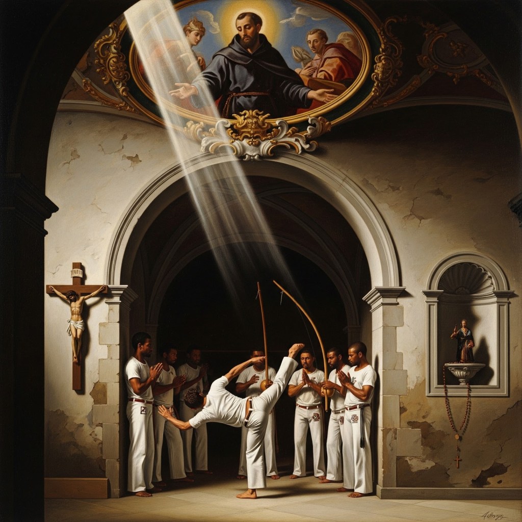 - Capoeira and Disguise: Capoeira itself served as a form of resistance and cultural survival, disguised as a dance or folklore to deceive the slave masters. While not a religious practice in the same way as Candomblé, Capoeira’s philosophy and worldview were deeply influenced by the spiritual and cultural environment of the senzalas (slave quarters) and quilombos (runaway slave settlements), which were hotbeds of syncretic religious life. The movements, songs, and rituals often carry subtle references or undertones reflecting this cultural and spiritual background.