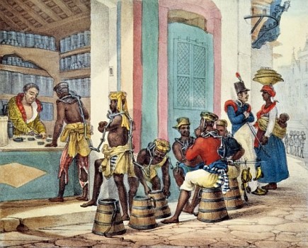 XIR379738 Manacled slaves buying tobacco from a Tobacco shop in Rio de Janeiro, 1835 (colour litho) by Debret, Jean Baptiste (1768-1848); colour lithograph; Biblioteca Nacional, Rio de Janeiro, Brazil; (add. info.: illustration from ‘Voyage Pittoresque et Historique au Bresil’); French, out of copyright